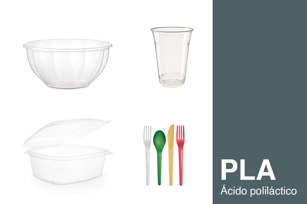 El ácido poli láctico o poliácido láctico (PLA) es un polímero constituido por moléculas de ácido láctico, con propiedades semejantes a las del tereftalato de polietileno (PET) que se utiliza para hacer envases, pero que además es biodegradable. Y su apariencia es extremadamente similar al “plástico tradicional” por lo que, sin la infamación necesaria, puede ser confundido y no llegar a valorarse esta alternativa. /L’àcid poli làctic o àcid polilàctic (PLA) és un polímer constituït per molècules d’àcid làctic, amb propietats semblants a les de l’tereftalat de polietilè (PET) que s’utilitza per fer envasos, però que a més és biodegradable. I la seva aparença és extremadament similar a el «plàstic tradicional» pel que, sense la infamació necessària, pot ser confós i no arribar a valorar-aquesta alternativa.