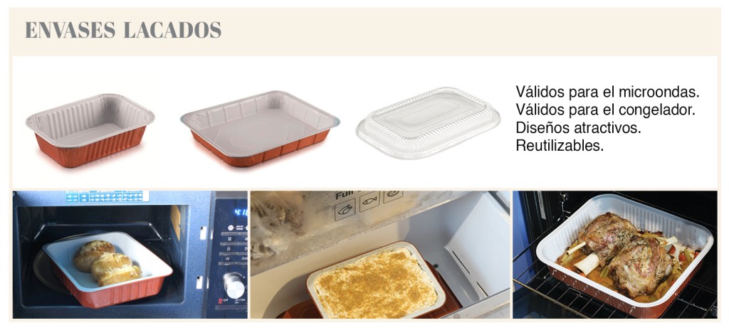 Los envases de aluminio lacados tienen ese extra que les hace únicos, y es el hecho de que se pueden calentar en el microondas; y son los recomendados para alimentos ácidos o salados.