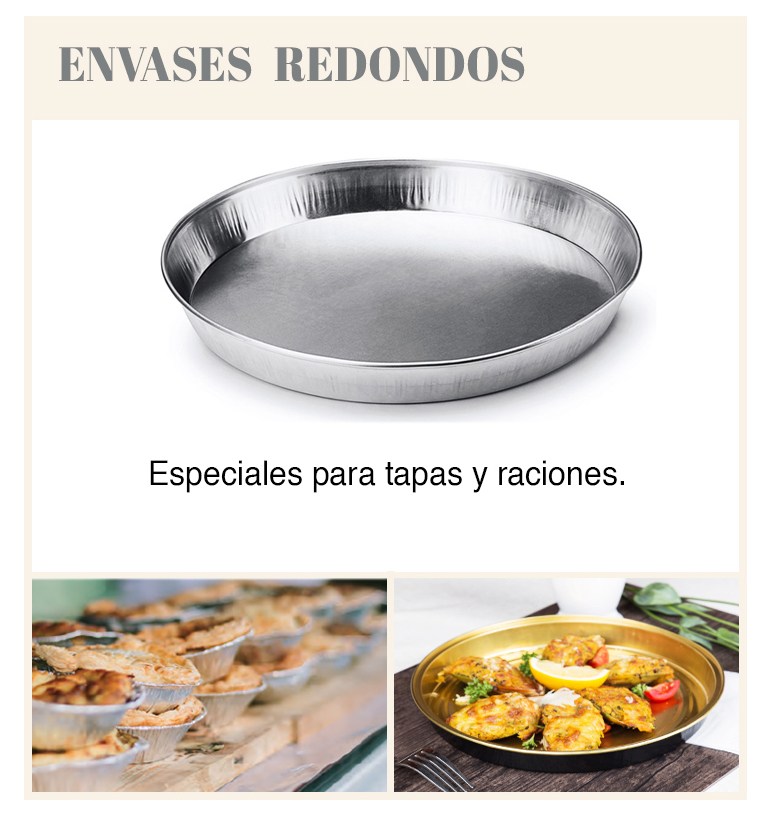Els envasos d’alumini rodons, també coneguts com a plats rodons d’alumini estan pensats per a grans racions d’un altre tipus de plats, com llagostins, paelles o graella de marisc.