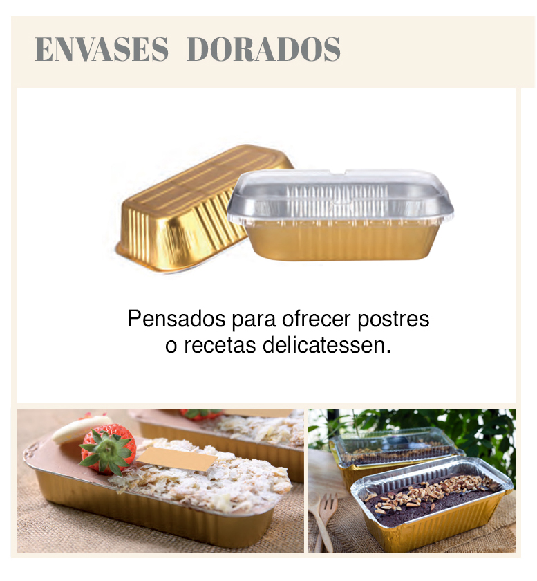 Por último tenemos los envases que tienen un acabado dorado, lo que les da un toque más festivo. Son utilizados para postres o alimentos delicatessen como pates o cremas.
