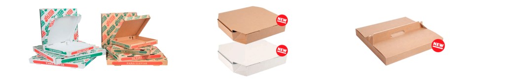 - Cajas para pizza, con las novedosas cajas octogonales o cajas con asa./ Caixes per a pizza, amb les noves caixes octogonals o caixes amb nansa.