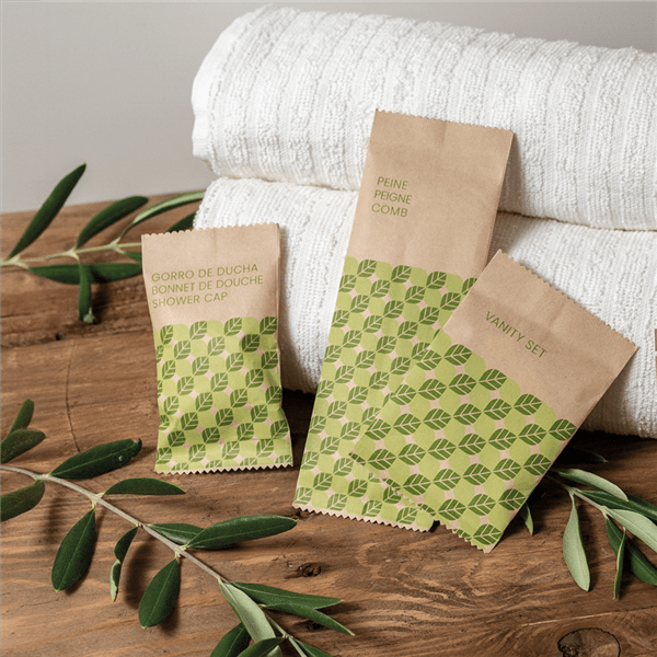 Artículos de bienvenida para hoteles con un diseño nuevo, con sobres de papel Kraft y con cargas doy-pack para recargar los dispensadores.
