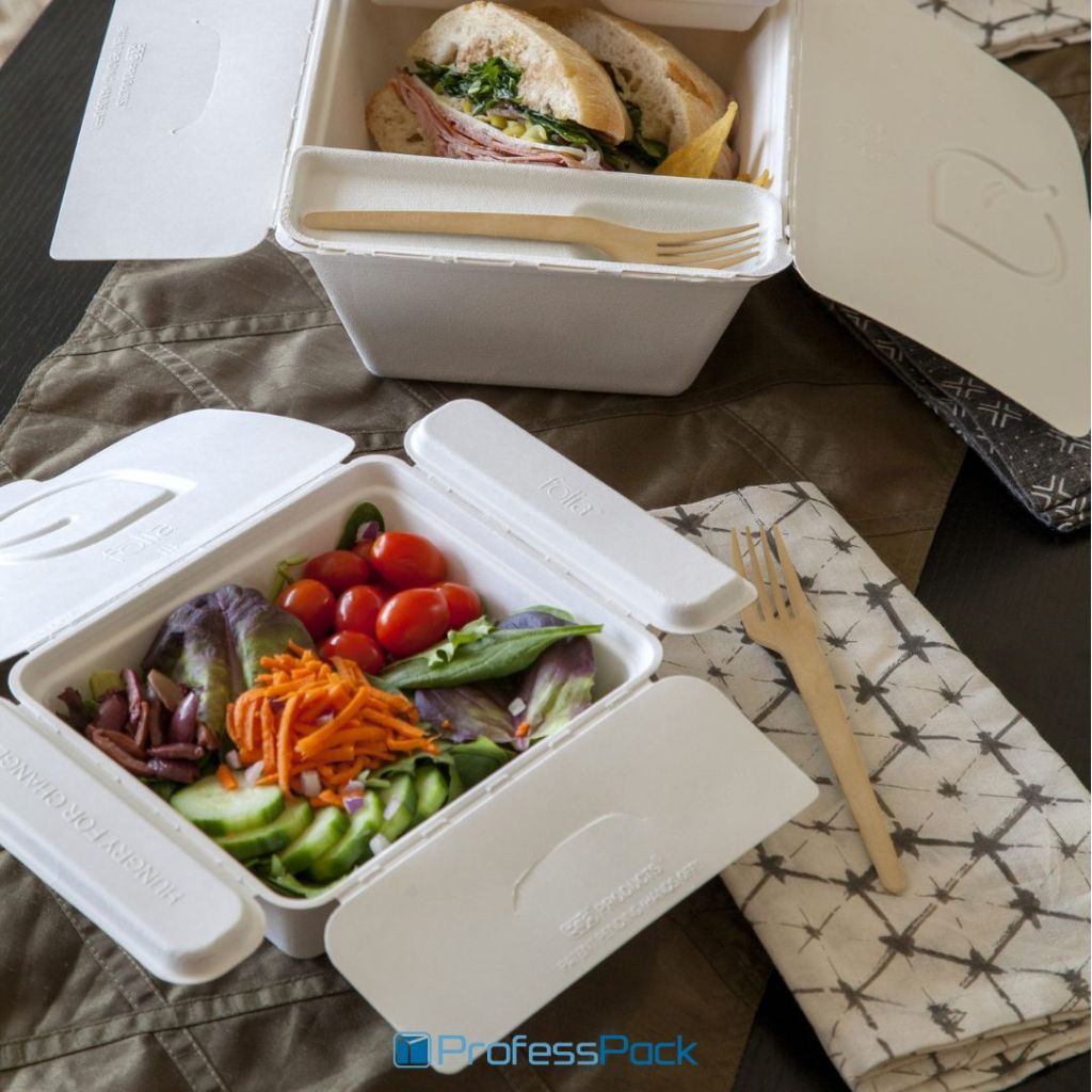 Los envases Folia de Ecoproducts son unos envases innovadores y sostenibles, ya que presentan solapas extraíbles para un acceso más fácil a los alimentos, solapas laterales resistentes a fugas que evitan derrames y sostienen condimentos y cubiertos.